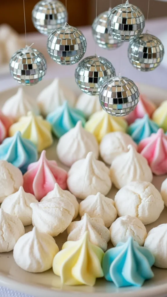 Bake meringue kisses in white or pale tones to reflect disco sparkle. Hang mini disco-balls above using clear thread taped to a stand. Guests enjoy the meringue while the display stays intact. Add powdered sugar for snow-like texture.