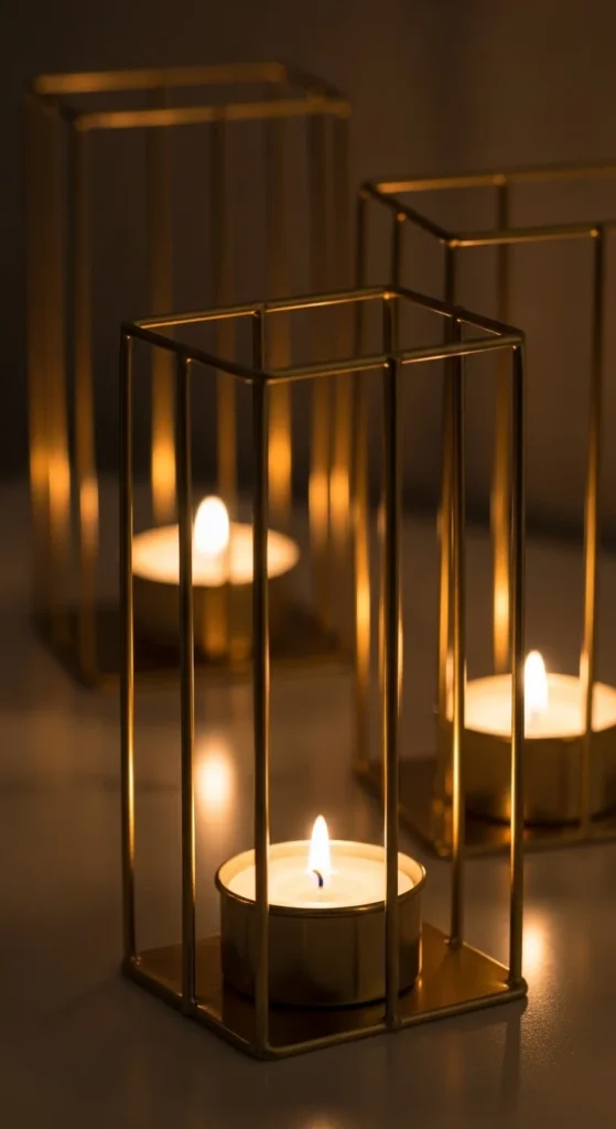 Making a cube-style holder is incredibly simple with square metal rods or even wooden dowels. Use strong glue or metal connectors to form the open frame, then paint the structure in matte or brushed gold. For budget-friendly styling, place the cubes on a mirrored tray so the lines reflect and make the setup look more expansive. You can also tuck tiny faux greenery pieces at the base if you want a hint of natural texture. This design fits beautifully into living rooms, dining setups, or even bedside spaces when you want a calm and chic glow.