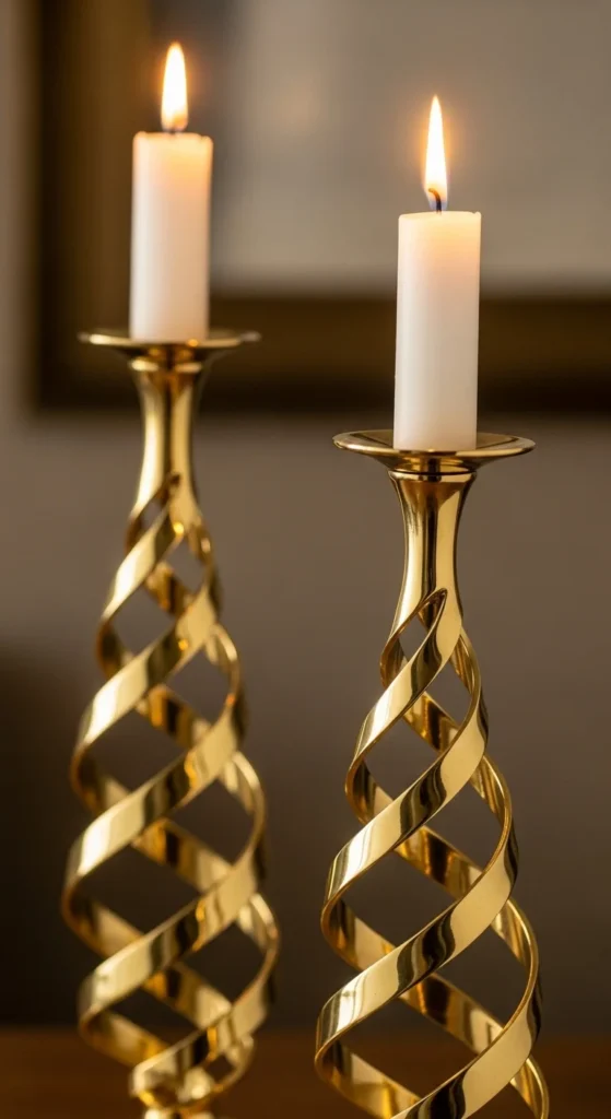 To recreate this style, use strong wire twisted into a spiral shape. Add a small round platform at the top for the candle. Coat the holder in gold spray paint. This design works best with small pillar candles or LED versions. Pair the spirals with glass beads or reflective coasters to highlight the curves.