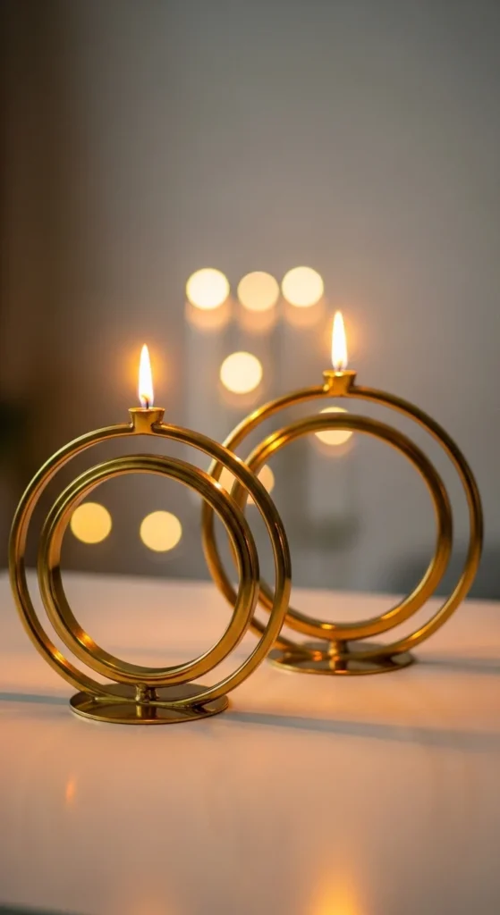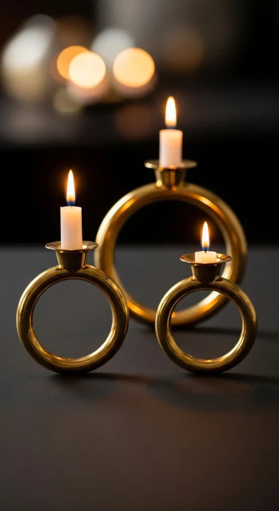 Gold rings offer a soft geometric look that fits perfectly into clean, modern setups. Their circular shape balances out harder angles in a room. Place three rings of different diameters together for a calm visual flow. Use tea lights or small votive candles for a warm, subtle glow.