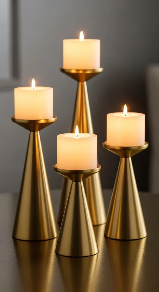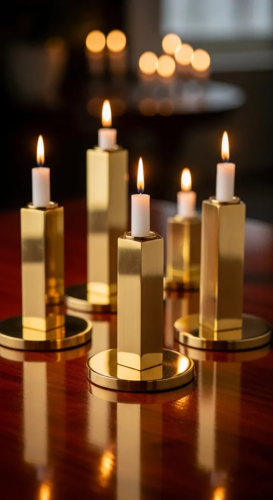 Create your own using wooden blocks shaped into polygons. Sand them smooth and coat with metallic gold paint. Add a shallow candle well on top for safety. Pair these blocks with neutral table linens or mirrored trays to highlight the shape. Their bold geometric texture instantly adds style without requiring additional decor.