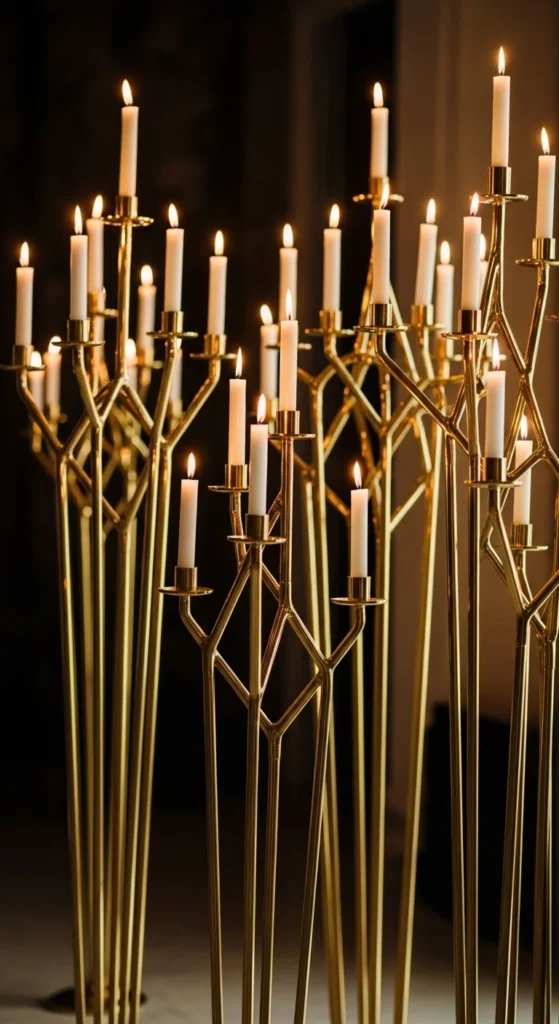 DIY versions can be made using metal rods arranged like branches. Attach small platforms on each arm for teat lights. Coat everything in gold spray paint. Pair these stands with minimal table decor so the shape stands out.