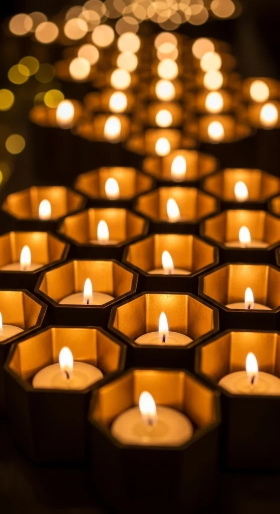 You can find affordable hexagon frames at craft stores or repurpose geometric metal shelves by turning them upright. Spray them with gold metallic paint and seal with a clear topcoat for a polished look. If you prefer a softer glow, use LED candles to avoid heat near metal edges. This style works nicely for New Year gatherings where you want clean lines but still want the room to feel warm and stylish. Pair them with a linen runner, a few sprigs of greenery, or even scattered confetti to create a balanced scene. Hexagon holders look especially striking when placed near mirrored trays because the shapes reflect light beautifully. Keep the rest of the decor simple so the geometric pattern stays the star.