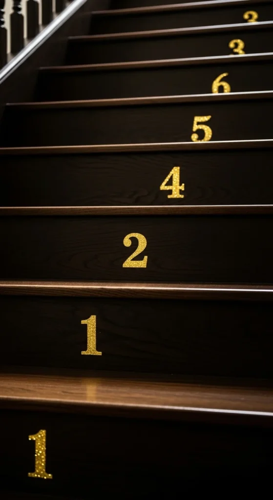 Numbering steps adds a playful countdown feel. Use glitter numbers—either adhesive or DIY cutouts. Center each number on the tread. Keep fonts simple for a tidy appearance.