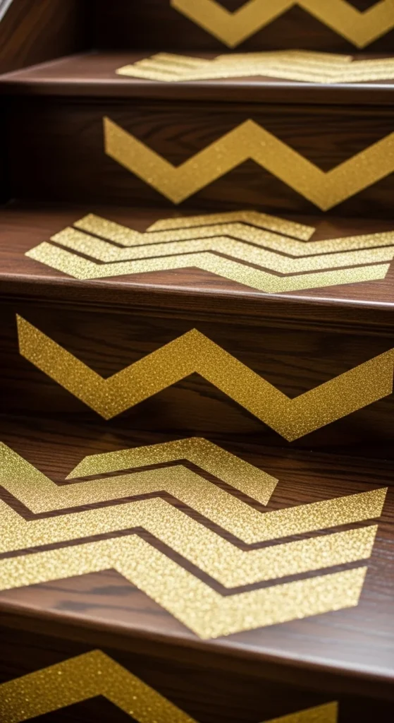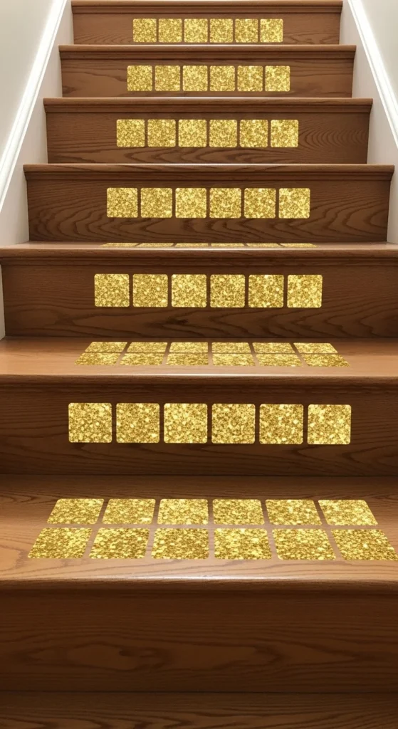 Thin borders offer a polished look. Apply narrow gold-glitter strips around the edge of each tread. Leave the center plain to keep things clean. This small detail creates rhythm without overwhelming the space.