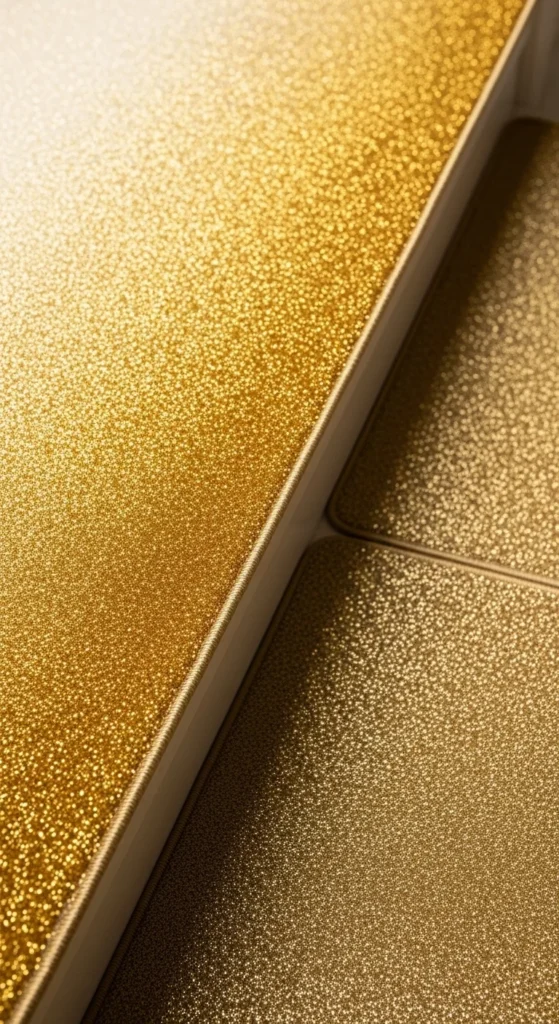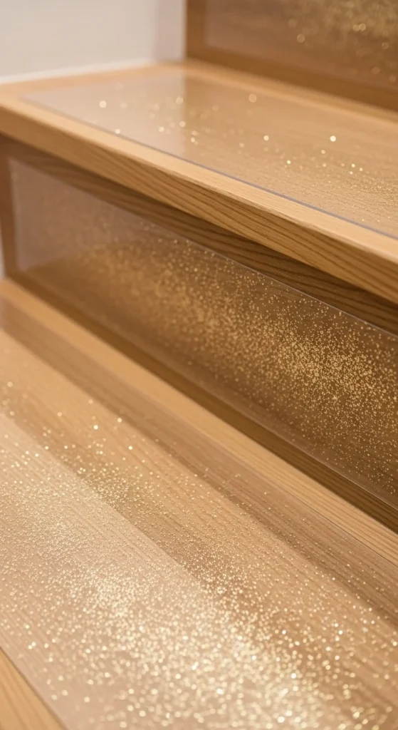 Champagne-gold glitter offers a calmer shimmer. Apply soft-tone glitter sheets trimmed to each tread. The muted gold pairs well with white, beige, and wood staircases.
