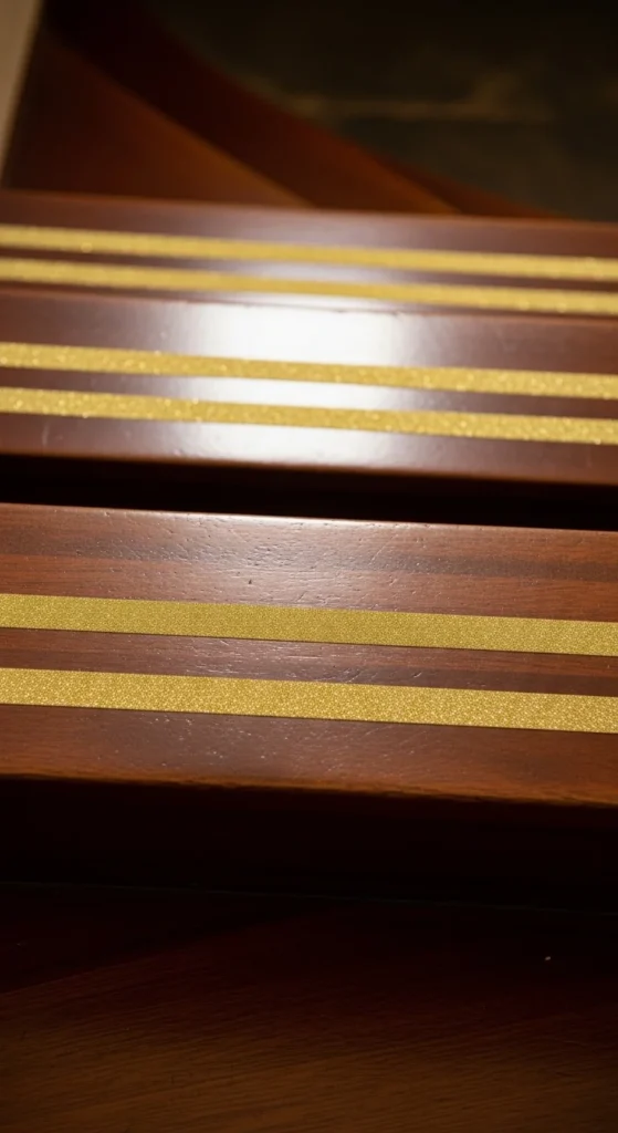 Dark wood paired with gold edging creates strong contrast. Run glitter tape along the edge of each tread. Keep the line straight and even. The thin sparkle enhances the wood’s natural tone.