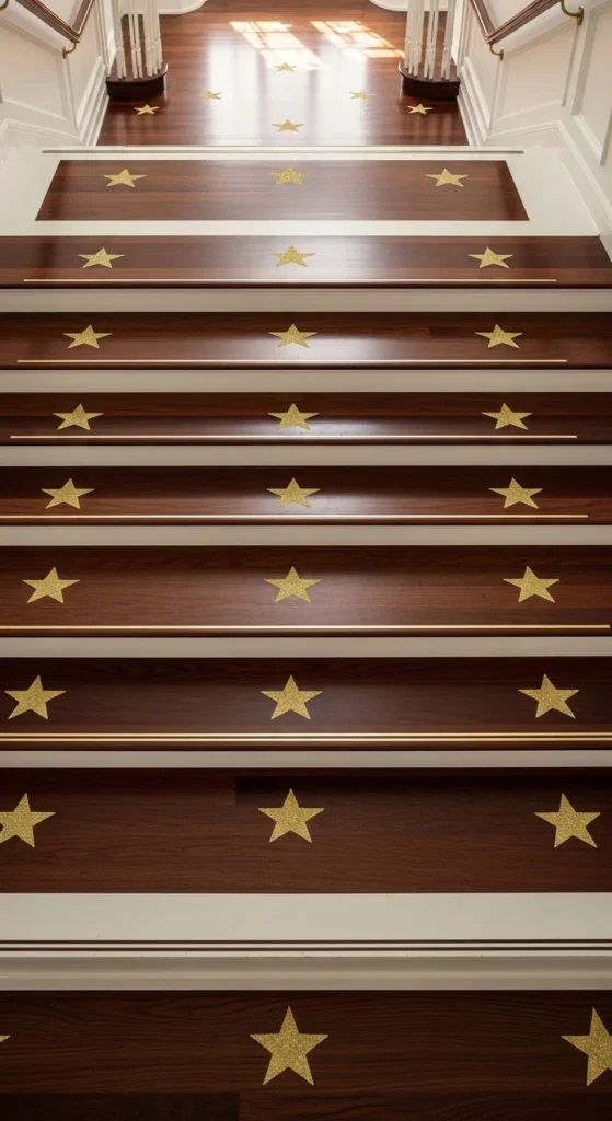 Star cutouts bring seasonal charm. Cut gold-glitter sheets into stars or buy pre-made decals. Space them evenly across each tread. Mix small and medium sizes for variation.