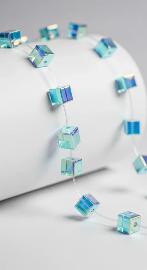 String lightweight mini holographic cubes along a clear fishing line to create a garland. Keep the cubes spaced evenly and attach the line across a wall or backdrop. Add soft backlighting to make the edges glow. For a budget version, use folded holographic cardstock to form tiny cube shapes. This garland works well above seating areas or behind chairs.