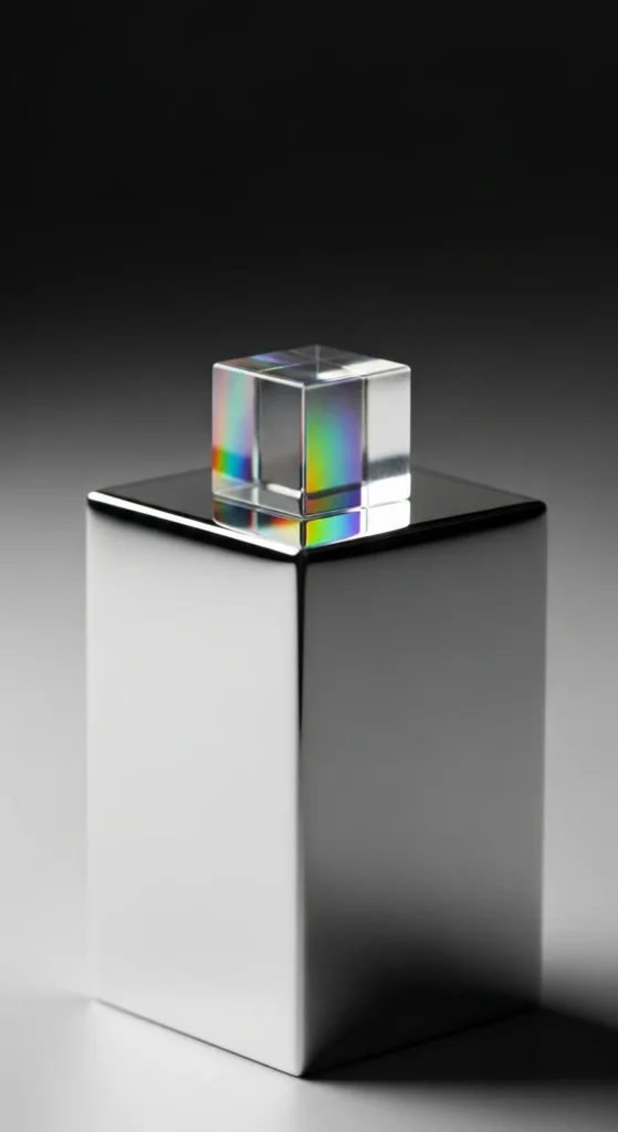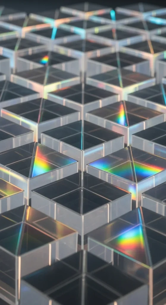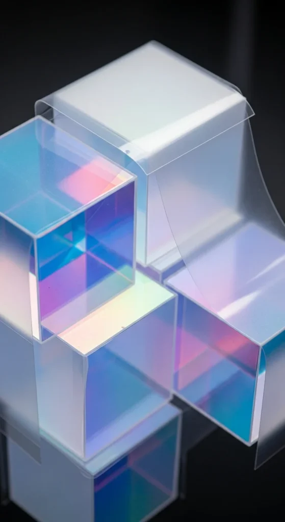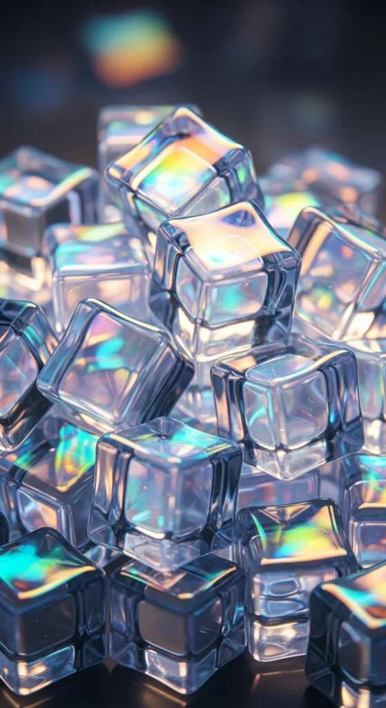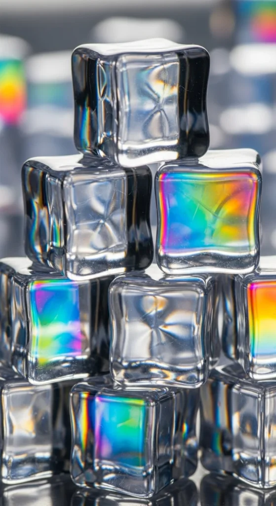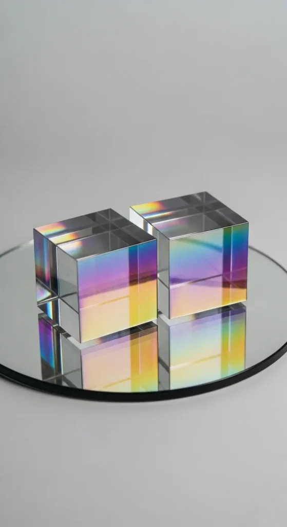 Stack holographic cubes in a staggered shape to highlight the rainbow edges. Keep the lighting warm on one side and cool on the other for maximum reflection. Use only three or four cubes if you want a minimalist look. Budget-friendly approach: use iridescent wrapping film to cover old cardboard boxes. This design is great for close-up selfies because the color gradients show clearly.