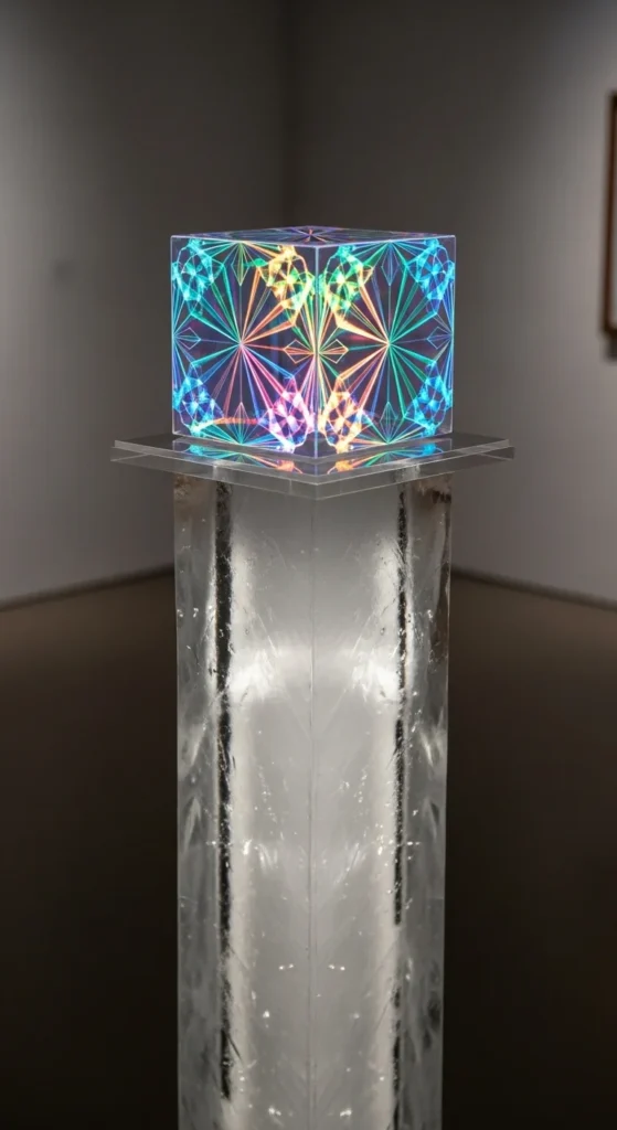 Place a holographic cube on a tall clear pedestal to give it presence. The height draws attention and encourages guests to pose beside it. Add a soft light at the base so reflections travel upward. For an affordable option, use a simple acrylic stand. This setup works well near photo backdrops.