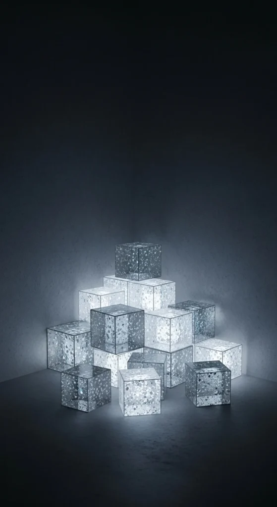 Place holographic cubes in a corner and shine a silver-toned light from one side. The shadows create a dramatic effect that photographs beautifully. Keep the cubes at different heights for dimension. Budget-friendly tip: use foam blocks as filler beneath smaller cubes. This setup is ideal for low-light photo styles.