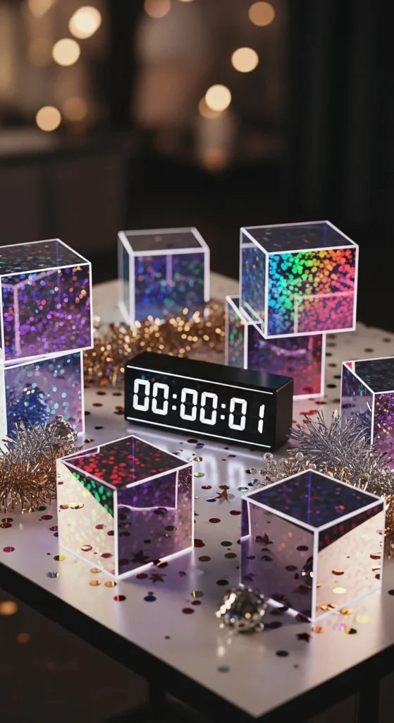 Holographic ice-cube props offer a playful and modern way to decorate New Year photo zones. Their reflective surfaces shift colors under simple lighting, making them ideal for small or large gatherings. These 23 ideas keep the materials light, easy to arrange, and budget-friendly. Mix heights, angles, and lighting to help guests capture fun, lively photos without complicated setups. If you want more holographic décor ideas, just tell me — I can create matching articles anytime.