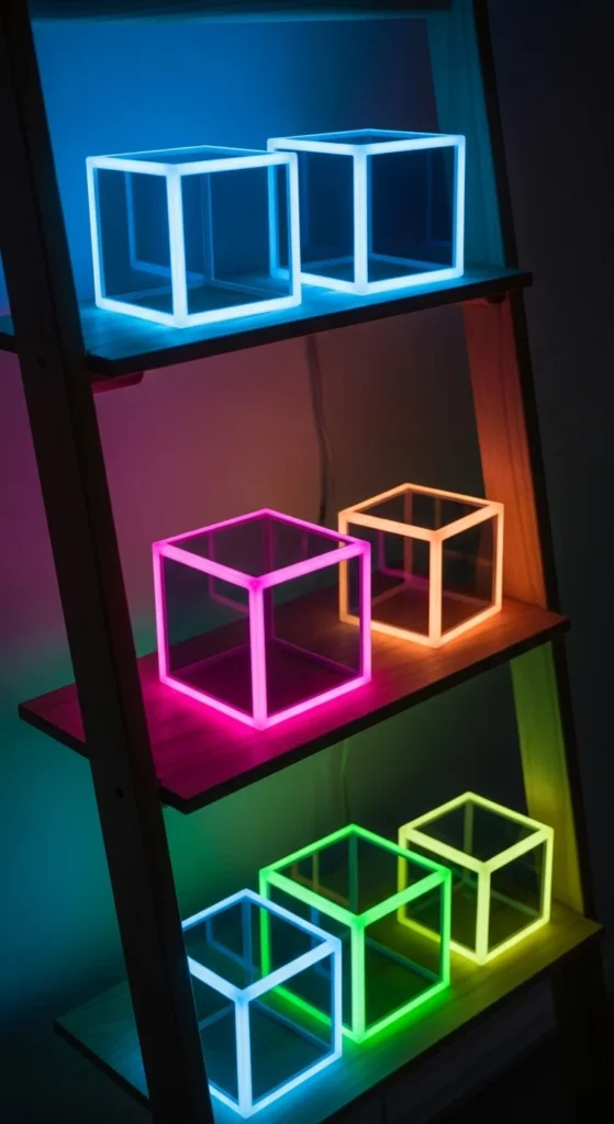 Arrange cubes on a ladder shelf so each step glows under neon lighting. Keep the positioning balanced. Add one cool-toned LED per shelf. If you’re working with limited resources, create smaller cubes so you can fill more steps. This design works well against plain walls for portrait-style photos.