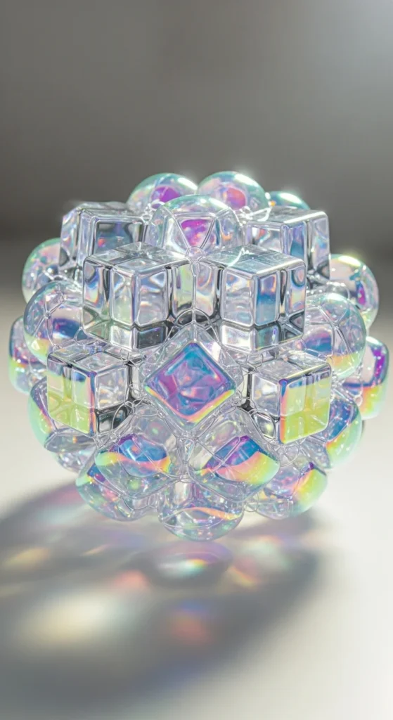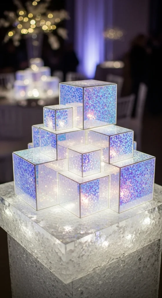 Arrange cubes into a rounded bubble-like shape. Keep larger cubes at the center and small ones around the edges to soften the form. Add soft cool lighting underneath to create a frosty glow. For a budget-friendly approach, alternate real holographic cubes with matte white filler cubes. This shape works well on floors or tabletops.