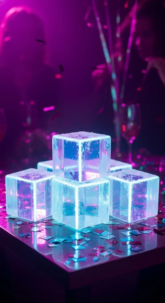 Place holographic cubes along your bar counter like a glowing runner. Mix cube sizes and angles so they look organic. Add white LED string lights behind the cubes for a frosty effect. For a budget option, create small cubes from transparent food containers wrapped in holographic paper. This setup makes the bar area photo-ready without taking much space.
