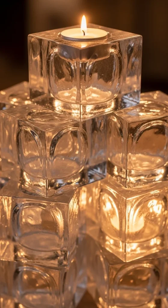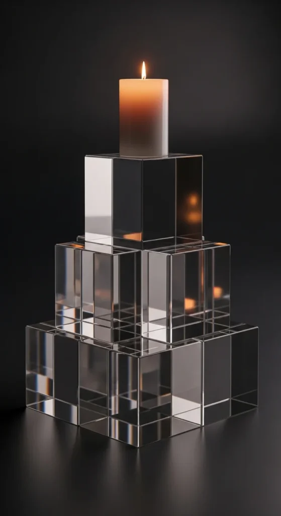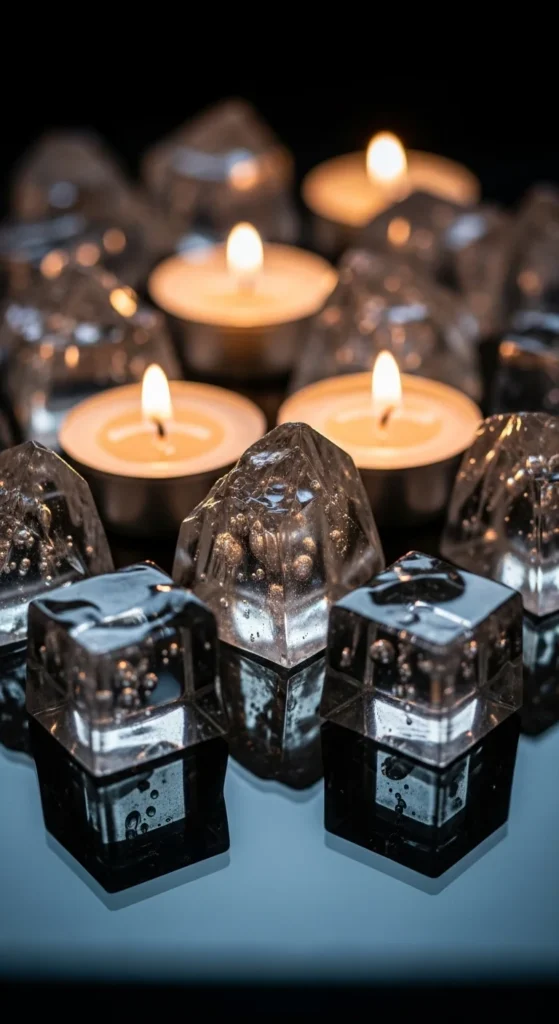 Create resin cubes using silicone molds and clear casting resin. Once cured, stack them loosely or spread around candles for an iceberg layout. Use cool-tone spotlights facing upward to cast crisp shadows. For renters or temporary setups, buy ready-made acrylic cubes instead.