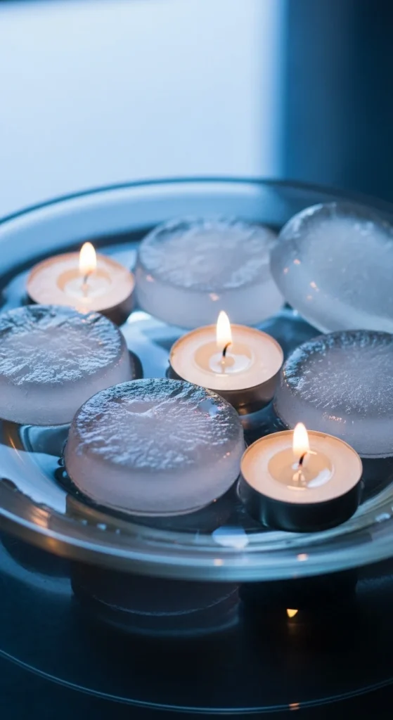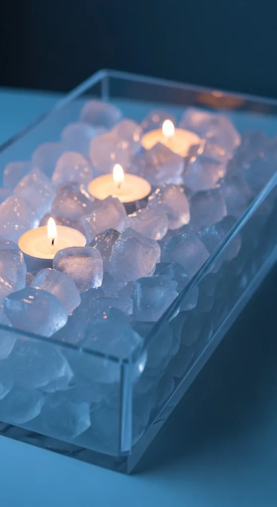 Buy faux acrylic ice chips from party or craft shops. Spread them evenly inside a low tray and place tea-lights in small carved pockets so flames look like melting points. Use cool LED strip lights under the tray for under-glow. Keep the tray color neutral so light reflection stands out. Works great for coffee tables or sideboards.