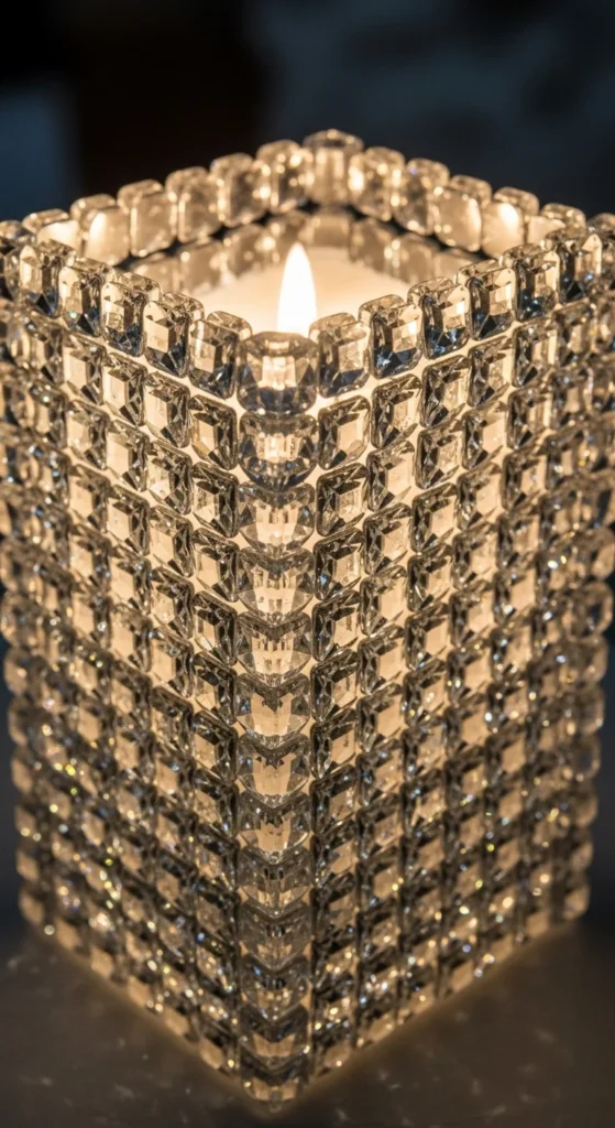 Cover a square block candle holder with small clear gem pieces using strong craft glue. Leave small spacing so light escapes. Use a cool-tone spotlight to get a diamond-ice sparkle.
