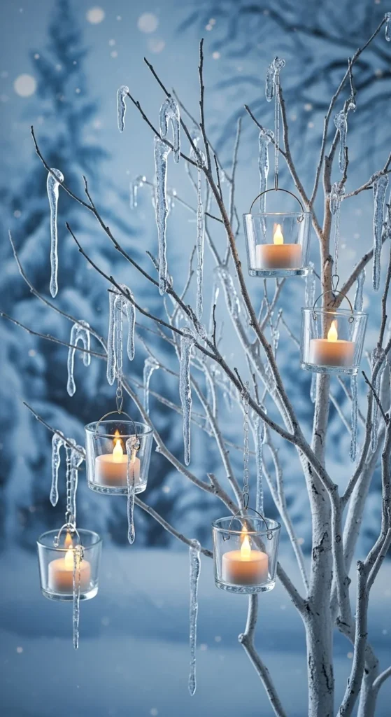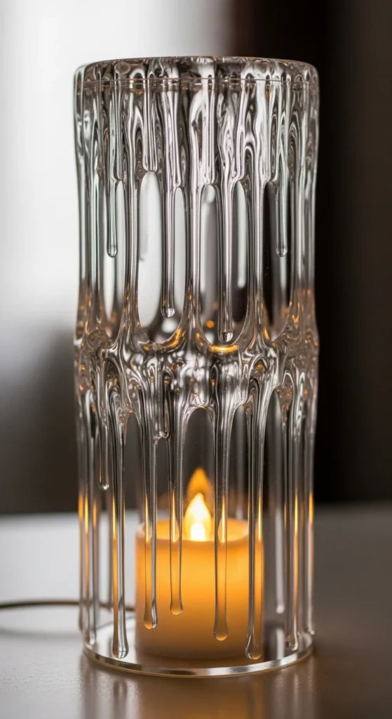 Use acrylic tubes with icicle drip details. If unavailable, glue icicle ornaments around a clear tube. Insert a flicker LED candle. Mount the tube vertically for a sculpture effect.