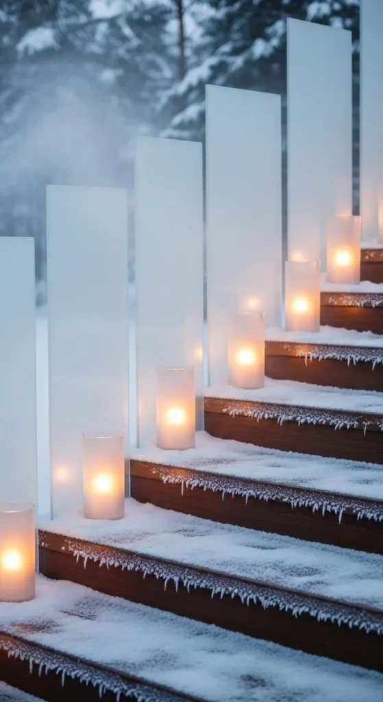 Place frosted acrylic or privacy panels along the stair wall. Add candles in safe glass cups on each step for an icy pathway photo moment. Use cool-white fairy lights hidden behind panels.