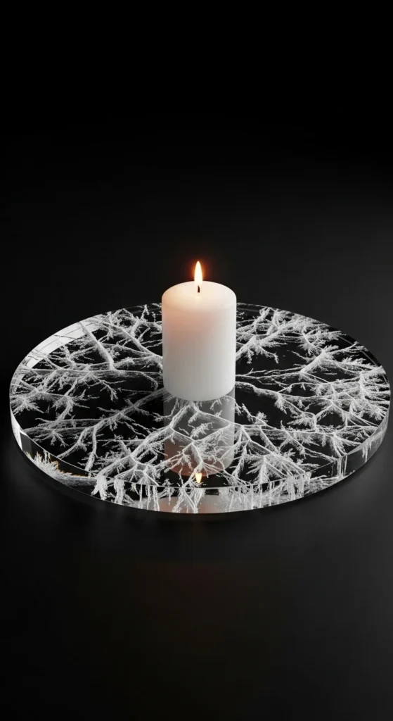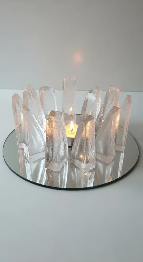 Break clear acrylic sheets into angular shapes (wear safety gloves). Arrange the shards around a candle on a mirrored plate for a sculpture-style design. Keep shards directed outward to mimic ice cracking. Use LED candles for safety. Add a light dusting of white powder pigment for subtle frost illusion.