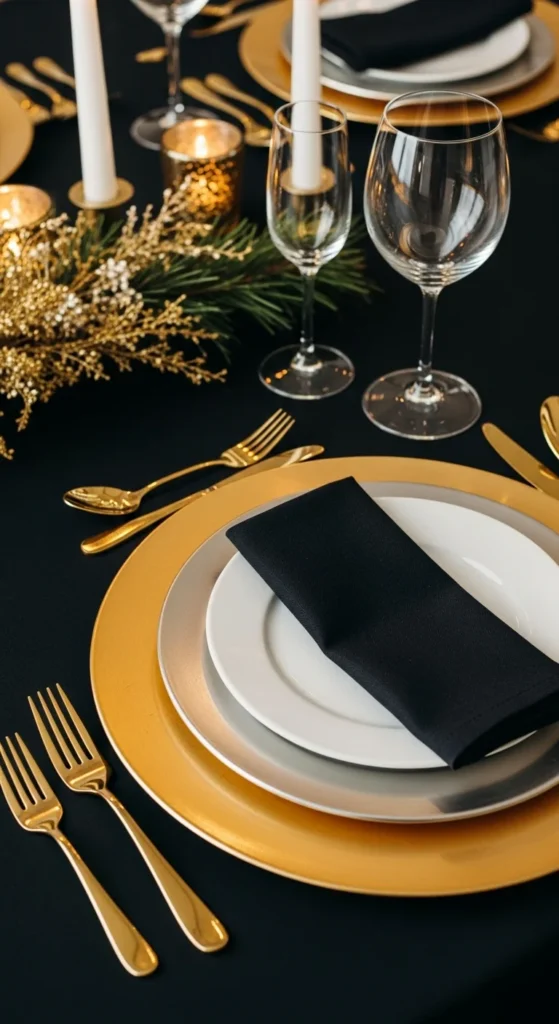 If you’re working with a tight budget, search thrift shops or discount stores for mismatched chargers in similar tones. You can spray paint older plastic or worn metal ones in matte gold or soft silver to unify them. Don’t worry if they’re not perfect; once stacked, small flaws disappear under plates and napkins. For a New Year look, pair your charger stack with simple white plates and a dark napkin, such as charcoal or navy, tucked under the plate. This contrast lets the metallic layers stand out while keeping the table calm and polished.