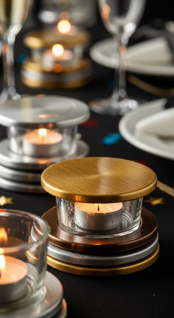 10. Layered Metallic Coasters Under Votives