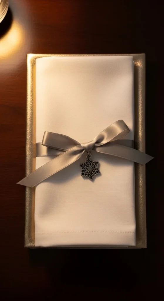 Napkins offer another chance to bring in metallic layers. Use a standard cloth napkin in white or linen and place a metallic napkin—gold, silver, or champagne—underneath. Let the bottom napkin show around the edges like a soft frame. Tie the stack with a narrow metallic ribbon and add a small metal charm or ornament on top.