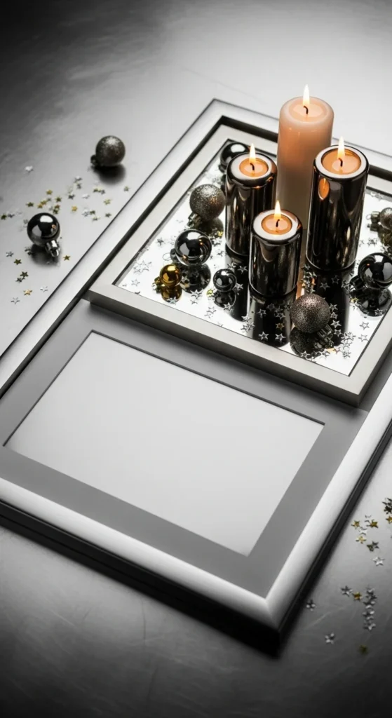 Photo frames can double as decorative risers. Place a large metal frame flat on the table and insert a mirrored tile or metallic cardstock where the photo would normally go. This creates a raised, reflective platform. Arrange candle holders, mini vases, or ornaments on top.