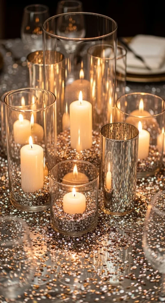 You can cut your own confetti from metallic wrapping paper or old gift bags. Use different shapes: circles, stars, or narrow strips. The glass softens the shine while the metals still catch light. This layered approach keeps the table tidy, since confetti stays under the vessels instead of spreading everywhere. It also creates visual depth with layers of glass, metal, and candlelight.