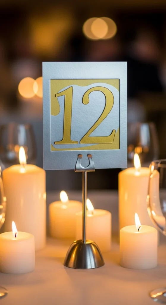 For a cost-effective option, repurpose cardboard and cover it with metallic wrapping paper before layering. Keep the font clear and simple so guests can read it easily. Place the table number near the center of the metallic decor cluster so it feels part of the design. This two-tone approach adds another layer of metal without crowding the table.