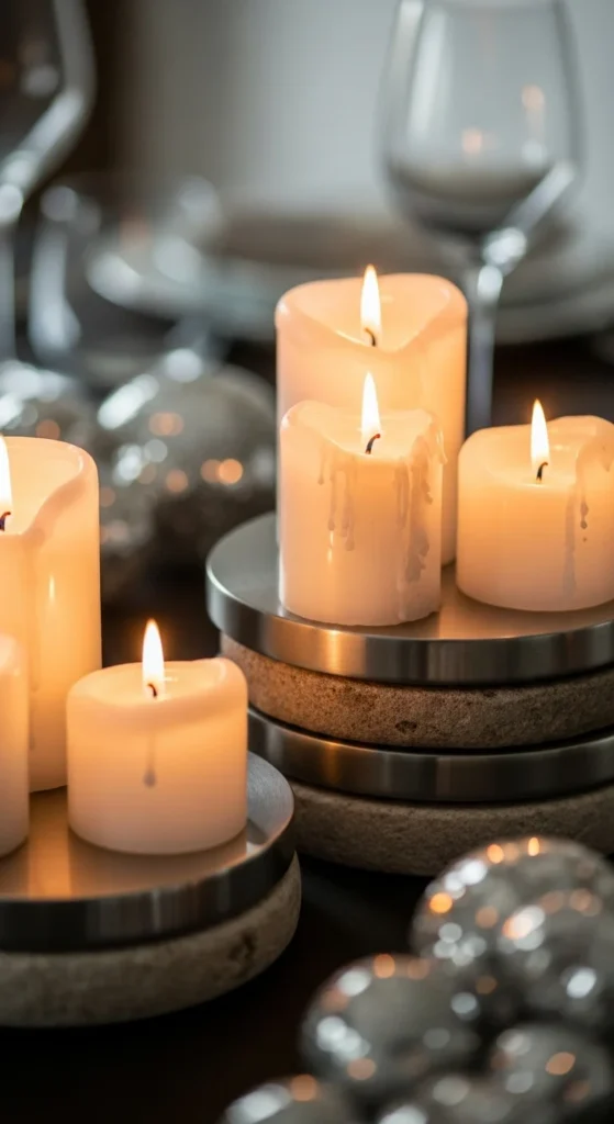 Combining stone and metal gives your candles a grounded, rich base. Stack a stone coaster or tile on the table, then place a smaller metallic coaster or plate on top. Set a pillar candle on the metal layer. The stone adds weight and texture, while the metal reflects the flame.