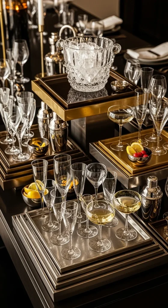Use one end of the table as a metallic drink zone. Layer two or three metal trays at different heights—one flat on the table, another raised on a cake stand, and a smaller one stacked on sturdy boxes wrapped in metallic paper. Place an ice bucket, champagne flutes, and bottles on the trays.
