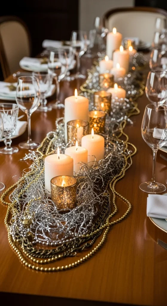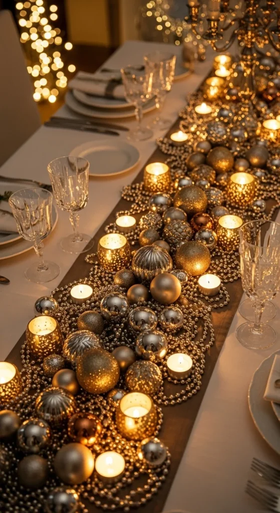Ornaments are not just for trees. Create a low, layered metallic runner by piling metallic ornaments along the center of the table. Mix finishes—matte gold, shiny silver, brushed bronze, and champagne. Weave metal bead strands or thin chain garlands through the ornaments. Tuck small candle holders between them.