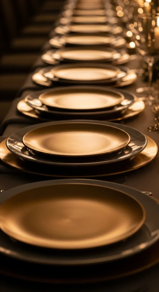Stacking chargers is one of the simplest ways to create layered-metallic table decor. Place a larger, brushed-gold charger on the bottom and a slightly smaller silver or gunmetal charger on top. Then add your dinner plate. The edges of both chargers peek out and create a full, rich frame around each setting.