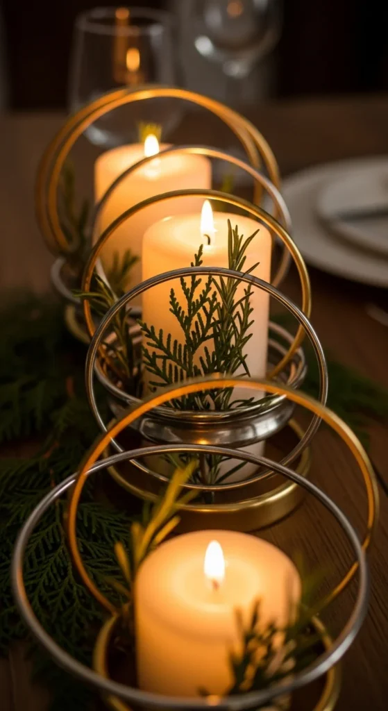 20. Layered Metallic Candle Rings and Greenery