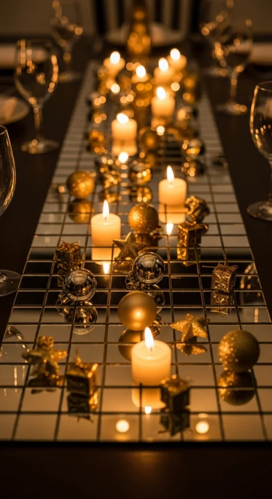 For a low-cost version, use mirrored craft tiles or even mirrored plastic sheets cut to size. Leave small gaps between tiles so the tablecloth peeks through and adds texture. Avoid clutter by keeping the decor focused: a few statement candle clusters and a bowl of metallic ornaments is often enough. The mirror does the heavy lifting by catching light and bouncing it around. This trick is especially effective in evening settings where candles and fairy lights play against the reflective surfaces.