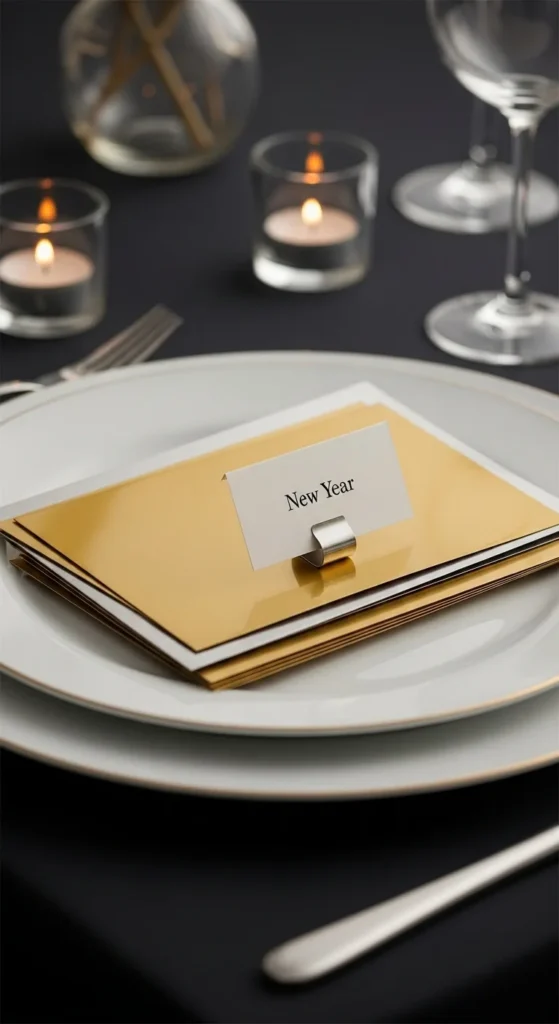 You can cut the cards from metallic scrapbook paper or repurposed gift boxes. Use a white or black pen for names. If you don’t have clips, punch a small hole and tie the layers together with thin metallic cord. Rest the finished place cards on each plate or prop them against the base of a wine glass. This layering brings metallic detail right into each setting without needing expensive accessories.