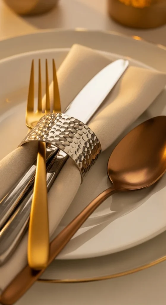 Flatware and napkin rings are perfect for subtle metal layering. Instead of matching every piece, combine gold, silver, and bronze. Use one metal for forks, another for knives, and a third for spoons. Then tie everything together with a metallic napkin ring, such as hammered brass or brushed steel.