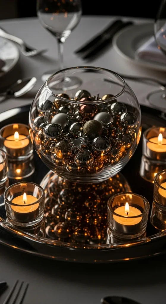 A central bowl becomes richer when you layer materials. Place a wide metallic tray on the table, then set a clear glass bowl inside it. Fill the bowl with metallic ornaments, glass baubles, or metal spheres in shades of gold, silver, and champagne. Around the outside of the bowl, on the tray surface, arrange tea lights in small metal cups.
