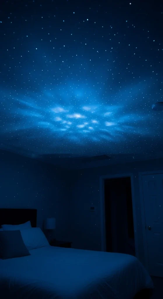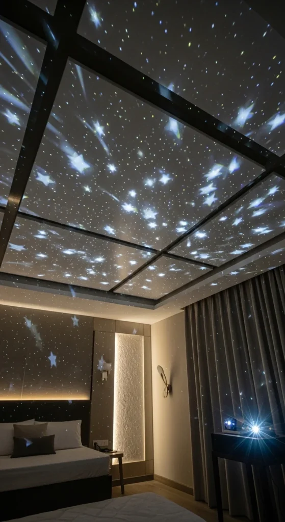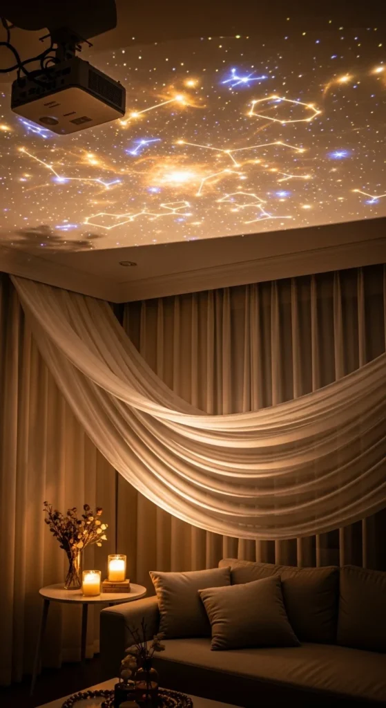 Star projectors are quick to set up and work best when paired with textured panels. Cut simple foam pieces with uneven shapes and attach them to the ceiling. When the projector shines, the texture creates deeper shadows and more interest. Keep furniture minimal so the ceiling stays the focus. This option is renter-friendly and very low-cost.
