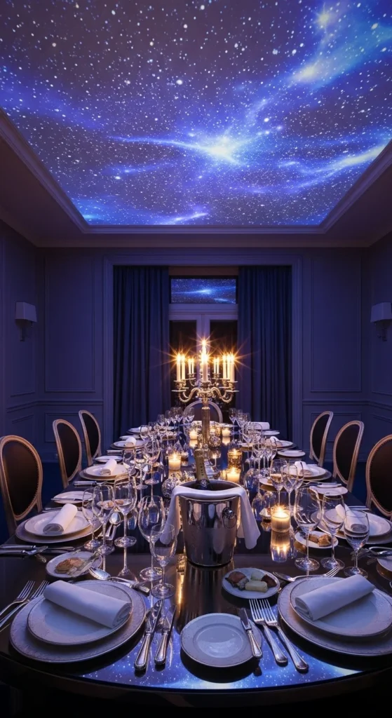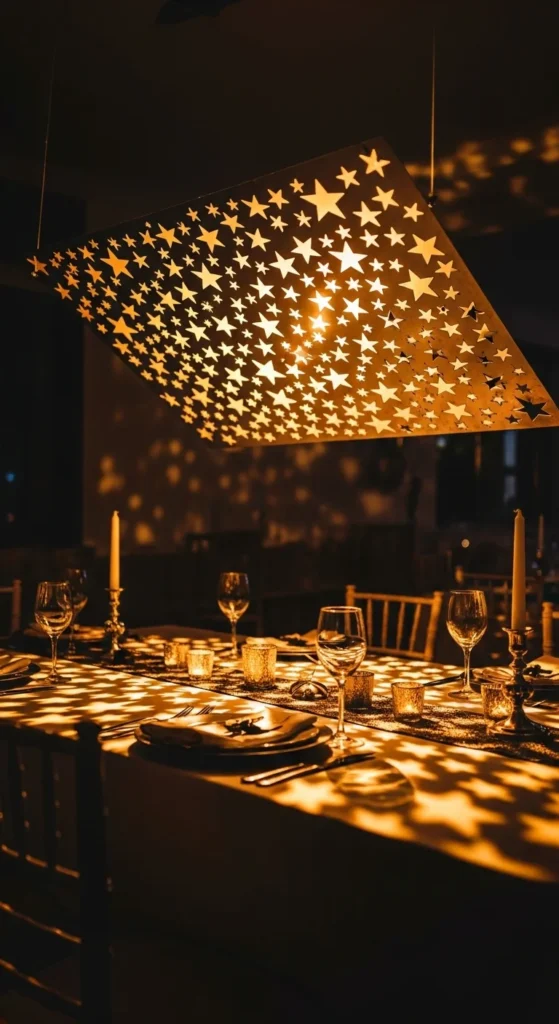 Placing a star-map above a dining table creates a memorable atmosphere. Keep the pattern centered for balance. Use dimmable LEDs so guests feel relaxed. Pair the setup with glass plates or transparent décor that reflects the sky. You can build a removable panel that sits just above the table, making it simple to install and store.