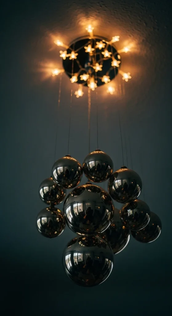 Metallic orbs catch and scatter starlight. Hang mini orbs or glitter spheres on thin string near the ceiling. Keep them at varying heights for depth. Position the LED star-map above them so the reflections shimmer. Use lightweight foam or plastic balls for an affordable option. This idea works especially well in party rooms where movement creates gentle glimmers.