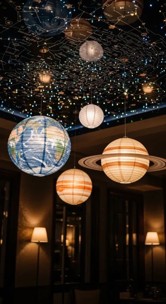 Paper lanterns shaped like planets add fun variety. Hang them slightly below the star-map so both layers shine together. Use cool colors like blue and lilac to keep the look cohesive. Add micro LEDs inside the lanterns for gentle internal glow. This approach is affordable and great for themed parties or family events.