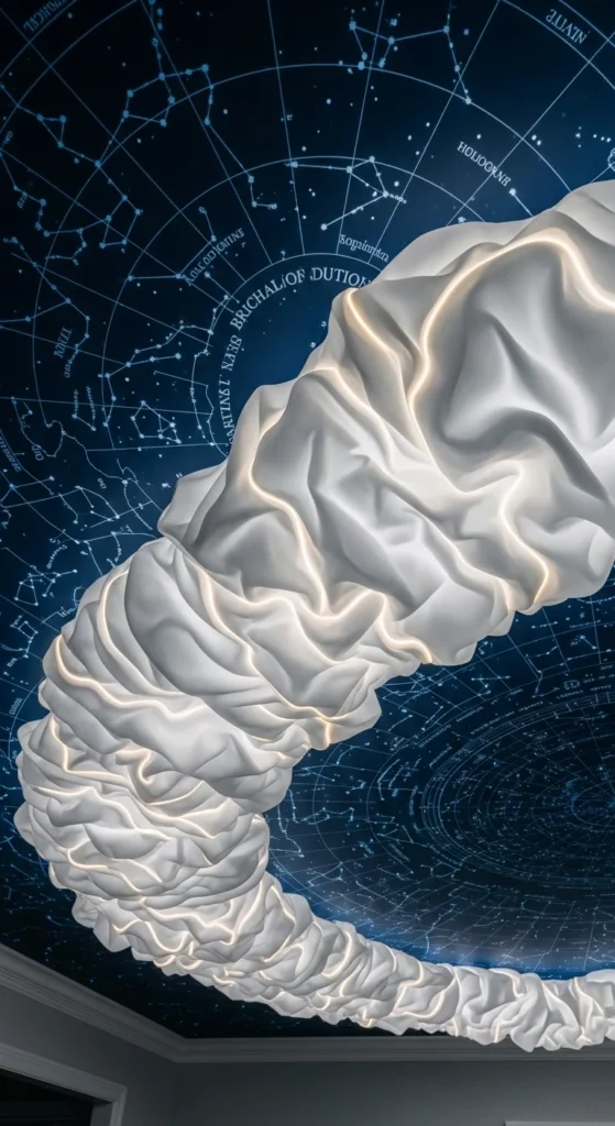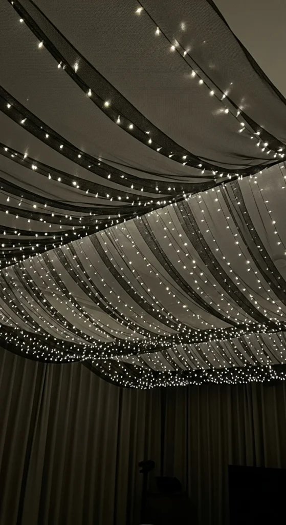 Curtains soften the glow of LEDs. Hang sheer panels along the walls so the ceiling lights reflect downward. This creates an immersive sky effect. Choose white or beige fabric for gentle diffusion. The setup is low-cost and renter-friendly, perfect for temporary holiday styling. Add small candles or lanterns below for warm reflections.