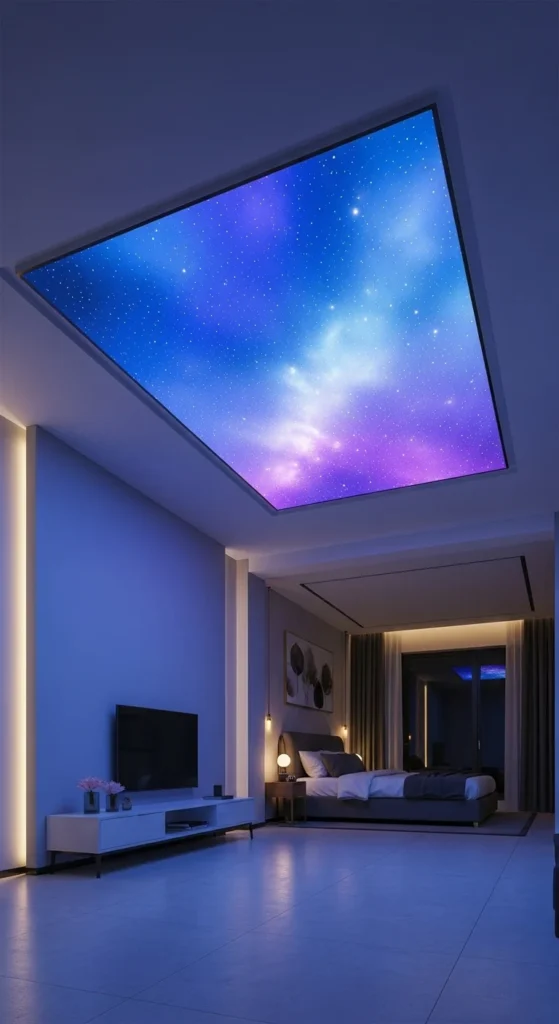 Using two LED temperatures adds dimension. Combine warm-white and cool-white dots to create a richer star field. Keep the spacing wide so the effect doesn’t feel crowded. Add one or two LED strips in the corners to ground the design. This idea works perfectly for rooms with mixed décor tones.