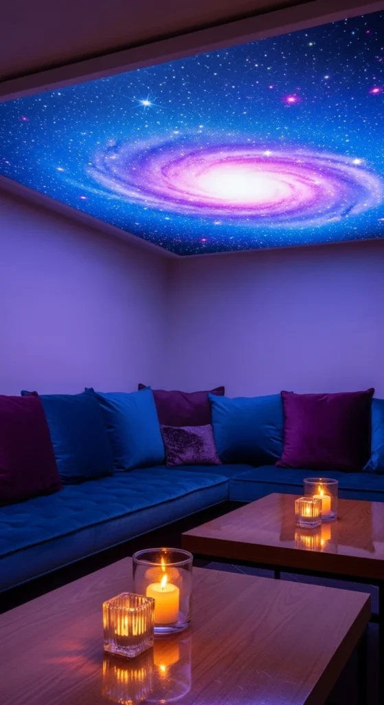 A lounge corner becomes more inviting when the ceiling sparkles. Install a small star-map panel above seating areas to create a relaxed glow. Use battery-powered LED strands arranged randomly to mimic scattered stars. Add soft textiles below to reflect the light gently. This idea works well in small apartments since it uses compact space while still giving a dramatic effect.