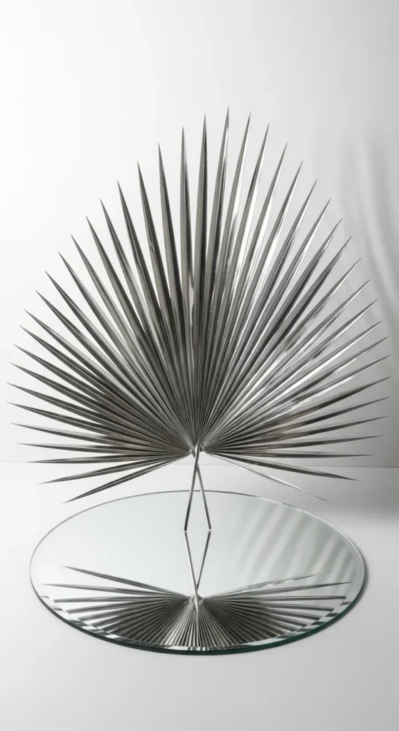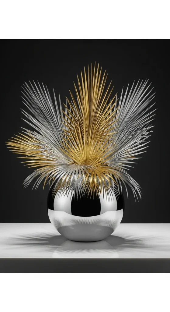 Place metallic palm fronds in a mirrored bowl to double the reflective effect. Keep fronds cut short so they sit neatly in the vessel. Add small ornaments or metallic spheres to fill gaps. A cost-saving trick is using a thrifted bowl with mirror-coated film. This arrangement works nicely on coffee tables or side tables because it stays compact. The reflective surface adds shine even in low lighting.