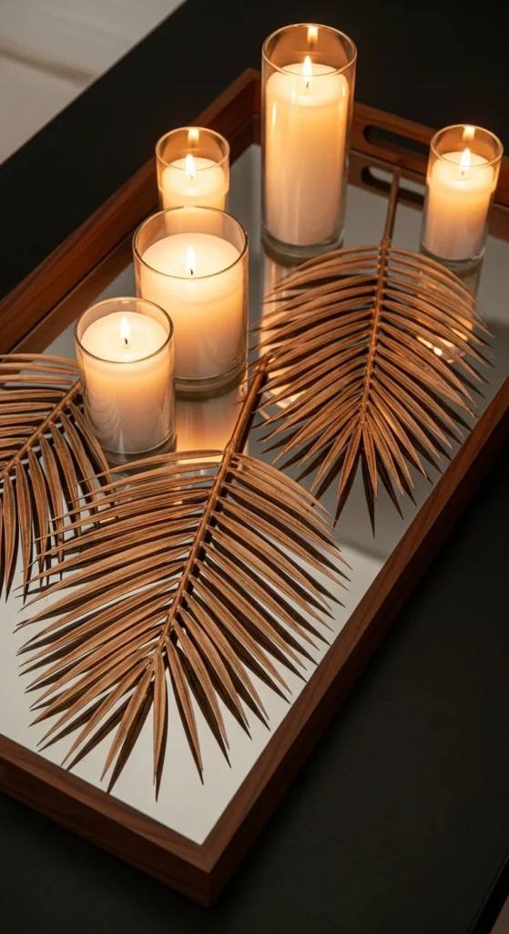 Place metallic palm fronds across a tray and add candles in the center. Keep candle heights varied. Use LED candles for safety. For an affordable tip, spray-paint older faux leaves in gold or silver. This tray centerpiece works well for coffee tables or small dining areas.
